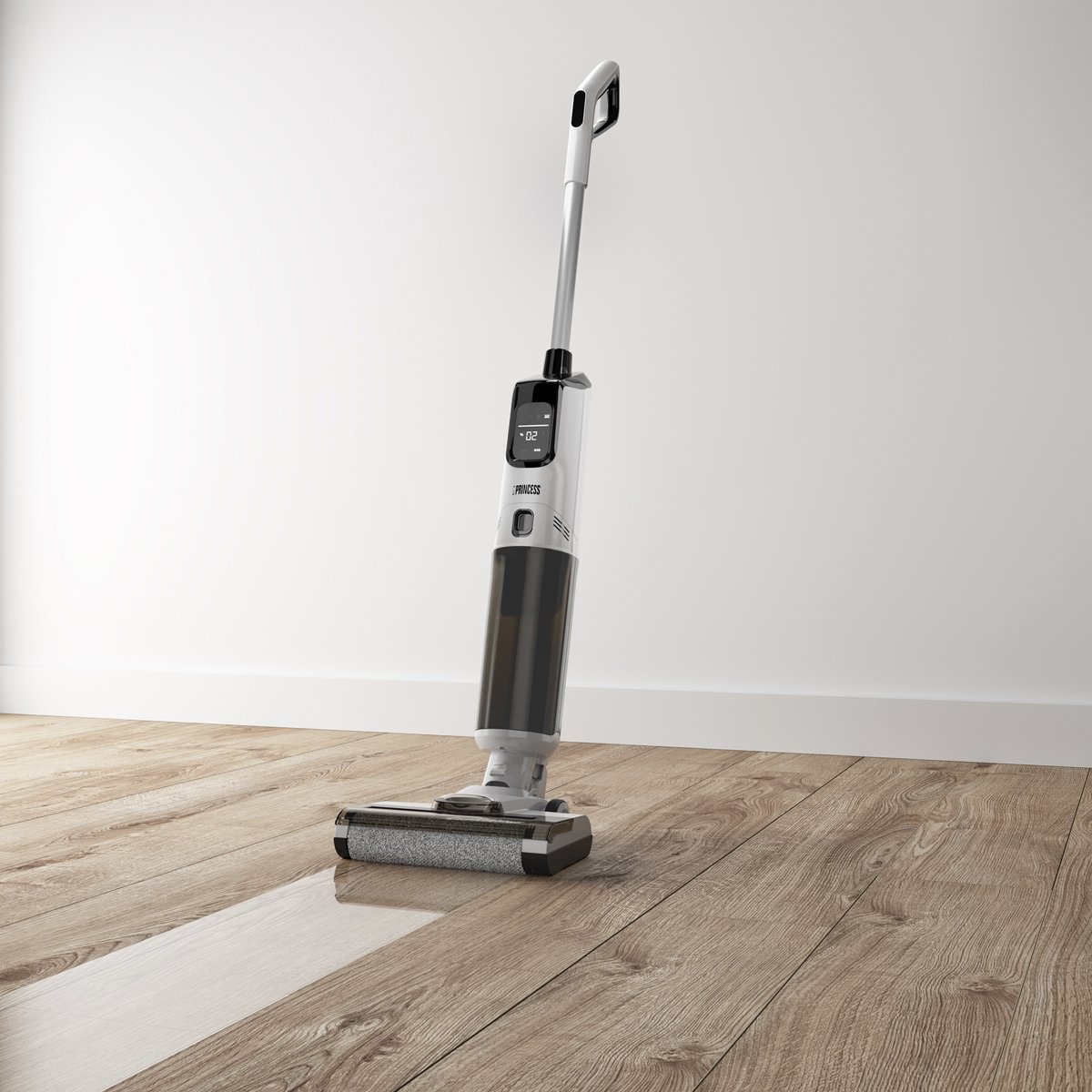 Maak kennis met de ultieme oplossing voor een blinkend schone vloer – de Princess AquaMotion Plus 4-in-1 vloerreiniger. Deze innovatieve, draadloze apparaat combineert stofzuigen, dweilen en drogen in één elegante stap, waardoor jij nooit meer meerdere apparaten hoeft te gebruiken. Dankzij deze slimme combinatie bespaar je niet alleen kostbare tijd, maar ook energie en moeite, terwijl je jouw harde vloeren ineens grondig en hygiënisch reinigt.